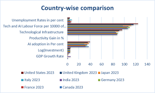 The quantitative analyses conducted in this research highlights the critical role of investment in technological infrastructure as a determinant of AI adoption and its subsequent effects on economic performance. The findings reveal a strong positive correlation (0.771) between AI adoption and technological infrastructure, indicating that countries with robust technological frameworks are more likely to invest in and adopt AI technologies. This relationship suggests that investment in infrastructure is foundational for facilitating the integration of AI into various sectors, thereby enhancing productivity and economic growth. Furthermore, the analysis of R&D investment shows a moderate positive correlation (0.624) with AI adoption, reinforcing the idea that countries that prioritize technological infrastructure and investment in R&D are better positioned to leverage AI for economic advancement. The visualization of investment levels relative to technological infrastructure indicates that countries with superior infrastructure tend to allocate more resources to R&D and AI initiatives, which in turn supports job creation and reduces unemployment rates. The findings also suggest that the effectiveness of AI implementation varies significantly across countries, despite similar levels of AI adoption. This variation can be attributed to differences in technological infrastructure and investment strategies, underscoring the importance of tailored approaches to infrastructure development in maximizing the benefits of AI.