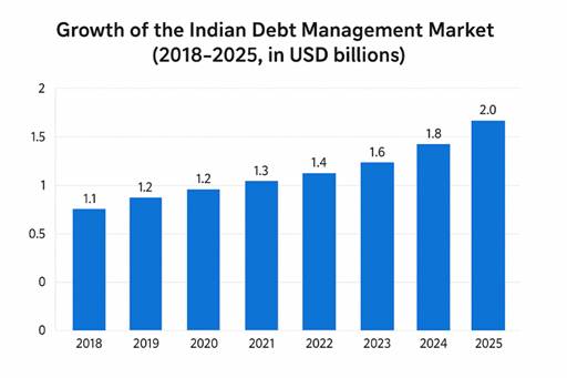 The debt management market of India is approximately USD 1.5 billion in value for the year 2025, growing at an annual rate of 7–8% per annum, driven by: